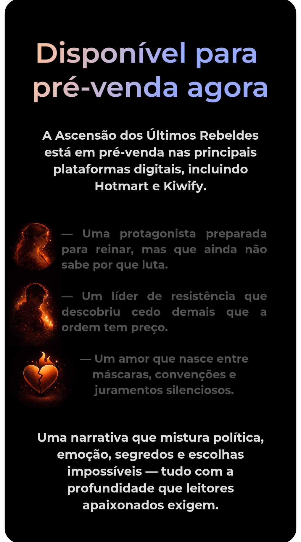 Se você já sentiu arrebatamento por histórias intensas, personagens com dilemas reais e reviravoltas que mexem com o coração, este e-book foi feito para você.